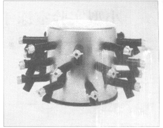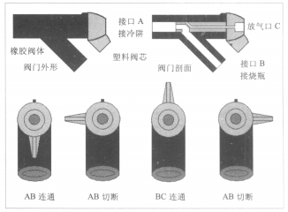 燒瓶凍干時要預先放好帶多歧管的鐘罩?,如圖 4、?圖 5 所示,冷阱降溫并抽好真空,這時把旋凍好的燒瓶??立即連接到閥門上,并轉動閥門使燒瓶抽空。多歧管上??的閥門是一個特殊閥門,轉柄有 4 個位置,箭頭向上,?鐘罩與連接口封閉;箭頭向左,鐘罩與連接口相通;箭 ?頭向右,鐘罩與連接口封閉,連接口與大氣相通(往燒瓶中放入大氣,以便取下燒瓶)。